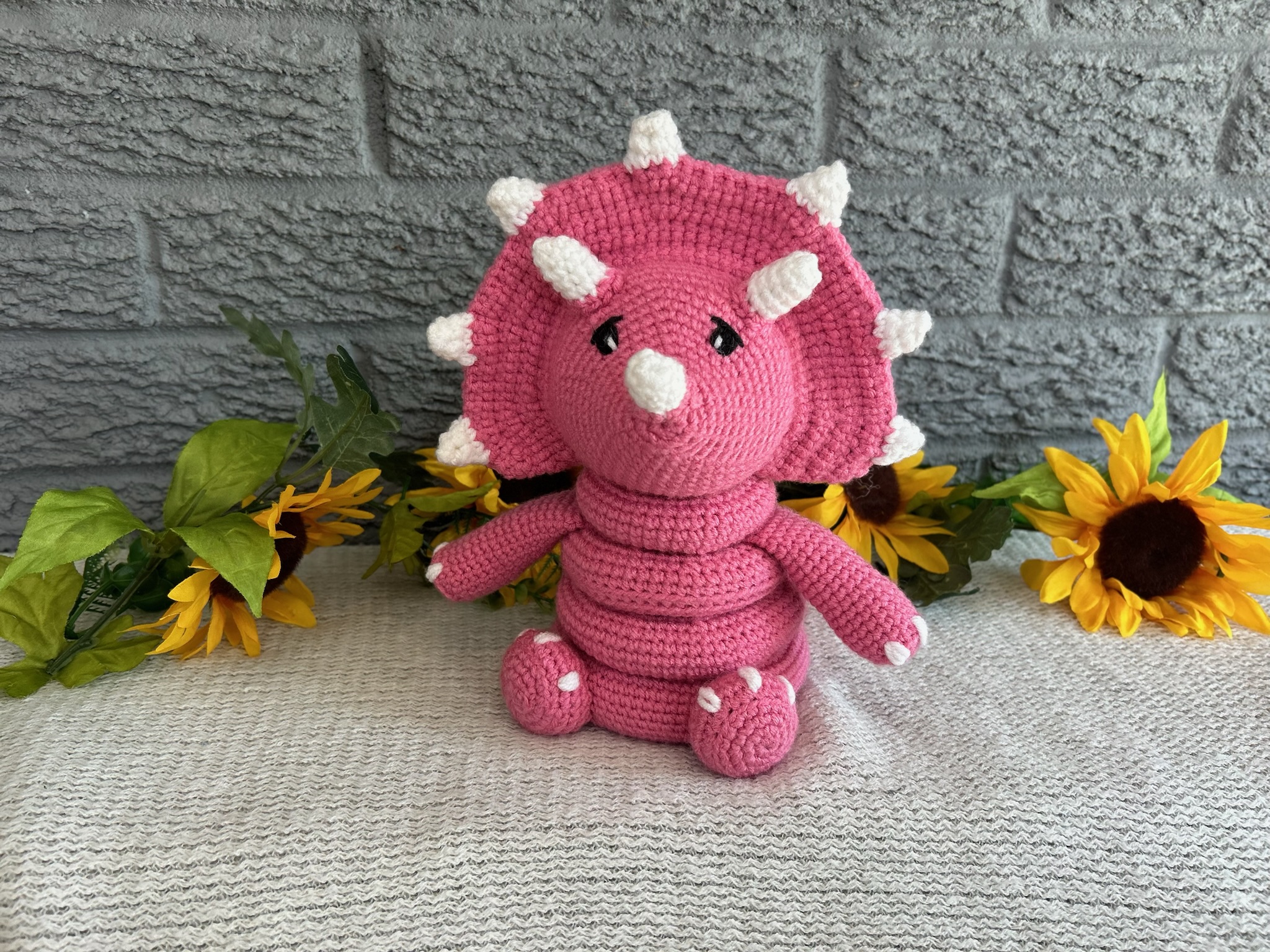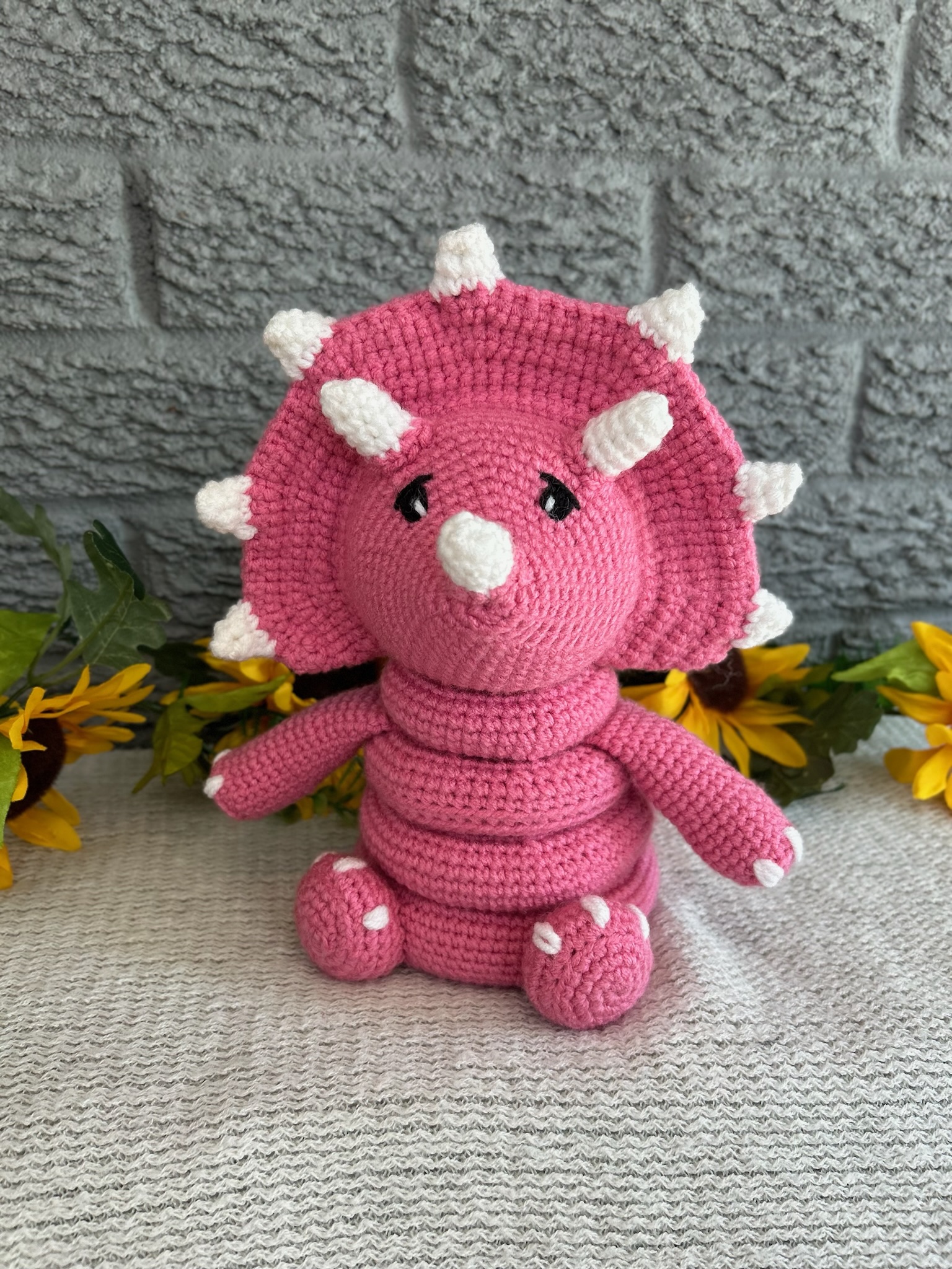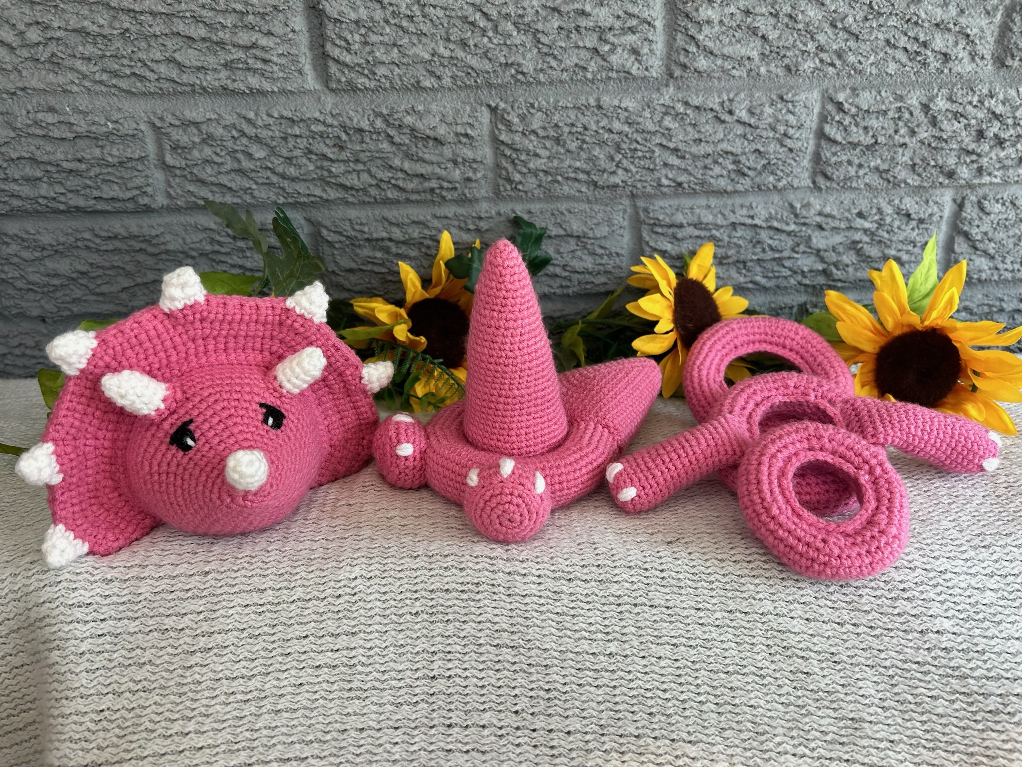 The crocheted Dinosaur Stacking Ring Toy is a delightful and educational plaything, perfect for young children. Handcrafted with soft, bright pink yarn, this toy features a charming dinosaur base with colorful rings that stack on top, enhancing both visual appeal and motor skills development. Each ring is uniquely textured, providing sensory stimulation and encouraging babies and toddlers to practice hand-eye coordination as they stack and unstack the rings. Safe and durable, this adorable toy is made with non-toxic materials and securely attached parts, ensuring it can withstand enthusiastic play while becoming a cherished part of any child’s toy collection.